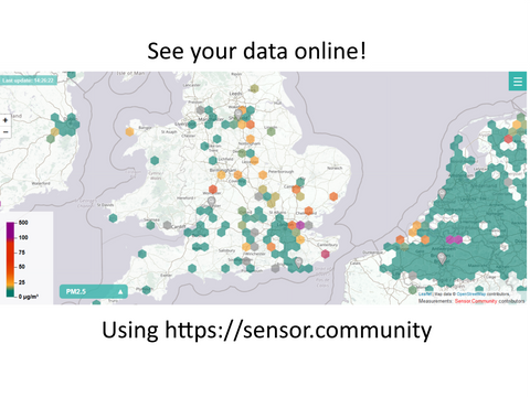 This kit contains all you need to set up your own online air quality monitoring unit. This records the PM2.5 and PM10 particulate data, along with temperature and humidity. This is sent (via your Wi-Fi connection) to the sensor.community platform, which can be viewed here: https://maps.sensor.community